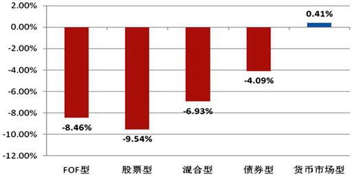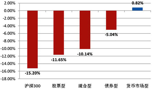 受到股债双杀的影响,股基、债基齐陷亏损的泥淖。其中,纳入统计的265只股票型基金下跌11.65%,表现最好的是建信稳健,收益仅为1.49%;混合型基金下跌10.14%,表现最优的长信双利亏损2.12%;债券型基金下跌5.04%,表现最好的嘉实多利优先实现收益1.23%。与券商集合理财产品一样,货币型成为唯一实现正收益的基金类型,收益为0.82%。