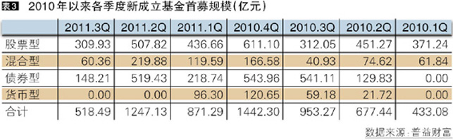 从基金首募规模来看,2011年三季度66只基金共募集资金518.49亿元,平均每只基金规模为7.86亿元。总体来看,今年基金发行市场呈现基金数量扩张“大年”、首发规模“小年”的状况。目前,规模在2亿-5亿元的“袖珍”基金遍地可寻,首募超过10亿元的已属“个中翘楚”。而在基金的高峰期2007年,平均首募规模达到70.22亿元,成立规模动辄上百亿,华夏全球精选发行首日便认购了620亿元,最后成立规模为300.56亿元。