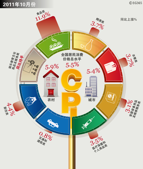 根据统计局数据,2011年10月份,全国居民消费价格总水平同比上涨5.5%。据测算,在10月份5.5%的涨幅中,去年价格上涨的翘尾因素近1.5个百分点,今年新涨价因素约为4.04个百分点。图片作者:EG365/CFP
