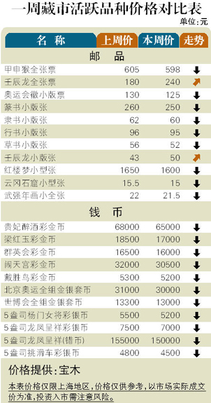 新年伊始,藏市整体走势依然平淡,市场热点主要聚焦在新发行的“壬辰龙”上。因此前市场期望颇大,故该票发行后,短线炒作炙热。邮市:强势品种阴跌格局延续,如双联小型张中的“邮联六大”和“改革开放”分别下挫至31元和49元。但“壬辰龙”全张票和小版张却高开高走,市价由发行初的180元和45元和攀升至240元和50元低近,短线投机氛围明显,但孕育的风险同样不小。币市:新品的接踵而至和国际金银价格振荡,令弱势金银币市场雪上加霜,不少品种价格继续下沉。其中“水浒”第三组彩金银套币下滑到1250元,2011版“熊猫”1盎司银币回落至255元,而“壬辰龙”5盎司彩银币下跌到6800元。