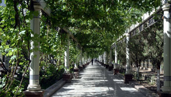 这是一座安静的城市。静生智慧,静出思想。如同欧洲的一些小城市一样,出了许多思想家,让世界为之瞩目。在这里,目光可以伸得很远很远,与起伏的山峦相接。即使在聂氏四十多度的气温下,走在绿荫遮敝的葡萄架下,也是清新纯醇,且伴有一阵阵淡淡的果疏香甜味。