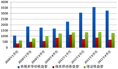 从银行理财产品的风险收益特征来看,本季度各风险类型产品发行总量均小幅下降。其中,保证收益型产品自2010年4季度以来一直保持较为稳定的发行量,本季度共发行1279款,环比减少93款,降幅6.78%;保本浮动收益型产品共发行683款,环比减少193款,降幅22.03%,是本季度降幅度最高的产品类型;非保本浮动收益型产品共发行3252款,环比减少316款,降幅8.86%。