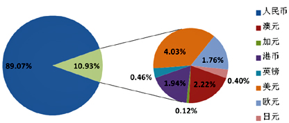 本季度发行的理财产品包括人民币、美元、澳元、欧元、港币、英镑、日元以及加元。其中,人民币理财产品共发行4644款,环比减少443款,市场占比由上季度的87.47%上升至89.07%。外币产品中,美元产品发行210款,环比减少48款,市场占比由上季度的4.44%下降至4.03%;澳元产品116款,环比减少33款,市场占比降低至2.22%;港币产品发行101款,环比减少18款,市场占比降至1.94%;欧元产品发行92款,环比减少44款,市场占比下降至1.76%;英镑产品和日元产品分别发行24款和21款,各减少10款和7款。另外中国银行和恒生银行共发行6款加元理财产品。(图4)