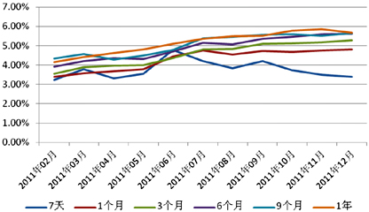 2010年以来连续 12次上调存款准备金率,使得货币乘数从2010 年一季度的4.35降至2011 年3季度的3.71,M2增速快速下降,银行吸储压力大增。而日均贷存比考核压力较大,存款增长乏力使得信贷供给大幅受限,而信贷需求依旧强劲,因而银行对资金的需求依旧紧张。但是,2011 年 11 月 30 日央行下调存款准备金率,扭转了自 2010 年以来提准、加息收缩流动性的政策方向,增加了银行体系的资金,有利于未来货币乘数的回升。另外,由于国内经济下滑风险加大,银监会推迟银行业新监管标准的实施,暂缓了银行的资本补充压力,银行在11份中旬以来,资金面逐步缓解。从SHIBOR走势来看,四季度SHIBOR走势相对平稳,但依旧是明显地以月度为周期上下波动,银行在月末冲时点的特征明显。(图7、图8)