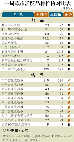 临近春节,藏市人流开始下降,大多数投资者无心恋战,长假情结若隐若现。邮市:近一周市场依然围绕“壬辰龙”版张进行炒作,但从上周初的逐步走高,到周中的创新高,再到周末的跳水下滑,市价也由235元攀升到330元的发行以来最高价,至上周末又回到250元。可以预料,该张在春节前后振荡在所难免。币市:金银币市场热点稀疏,尤其是不少前期强势品种抛压一直存在,令币商不敢承接,尽管开价变化不大,但真正成交价也仅70%。新面世的2012版“熊猫”全套(1盎司规格之下)金币价格在21500元附近,成交并不活跃。