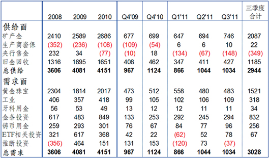 2011年前三季度需求水平维持08年以来的高位,需求总额3028吨,比2010年同比增长4%(表1)。供给方面,矿产金供给比上年同期增长15%左右,而全球央行黄金减持供给自2009年3季度开始由正转负以来,2011年全球央行净回笼黄金更是2010年的4.5倍,达到349吨。需求方面,伴随金价再创新高,黄金珠宝需求同比降低11%,但投资需求依然保持强劲增长势头,较上年同比增长29%,达到1088吨。