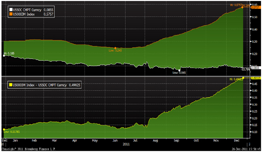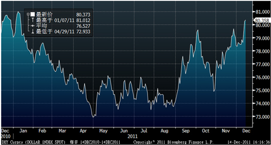 2011年欧债危机不断深化,对实体经济的影响已从外围国家向核心国扩散。根据欧盟统计局数据显示,欧元区2011年整体GDP持续低迷,前三季度GDP同比增速分别为2.7%、1.7%、1.4%,呈下降趋势,但欧元区CPI指数却持续攀高至11月底的3%。经济增长堪忧和通胀压力的抬头导致了欧洲央行货币政策的反复,今年以来欧洲央行在一年内经历了2次加息和2次减息,可见欧洲央行已将经济衰退风险作为重要因素考虑。欧元区信用风险的扩大化起于2011年7月份国际评级机构穆迪先后将葡萄牙和希腊等国主权信用评级调低,危机国国债收益率持续飙升。由于欧元区银行业面临危机国债券减记压力,以及对实体经济的担忧,导致信用风险迅速扩大。从欧元和美元Libor/OIS三个月息差走势看出,在7月份后息差持续扩大,并一度突破100个基点,截止