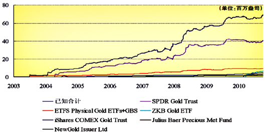 次贷危机以来,黄金投资性需求占比大幅上升,特别是黄金ETF在全球范围内发展迅速,持仓量从2008年以来已增长二倍(图7),2011年前三季度ETF持仓需求增长68吨,较前二年增幅放缓,但仍处于历史高位。由于欧债危机的不断蔓延,以及全球经济放缓,黄金避险保值的货币属性得以强化,收益率也明显高于其他风险资产。但黄金投资性需求占比的扩大,并不意味着金价将获得有利支撑,由于市场预期变化及投资流动性加剧,导致金价波动风险上升。