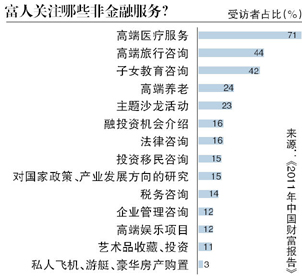 2011年,建设银行与波士顿咨询公司联合发布了《2011年中国财富报告》,报告通过对2000多名高净值人士的问卷调查和对多位私人银行客户经理及相关业界人士的访谈,清晰勾勒出中国高净值人士的群体特征、金融需求价值取向和机构偏好,全面深入剖析了中国财富管理市场,对预测中国私人银行业未来走向有着重要的意义,有效提升了建设银行私人银行的品牌影响力。报告对中国高净值人士的服务需求进行了客观研判描述,其中,最受欢迎的私人银行非金融专享增值服务为“高端医疗服务”、“高端旅行咨询”和“子女教育咨询”,其中:“高端医疗服务”关注度达到受访人群的71%,拥有较高教育水平的客户对高端文娱、健身项目和艺术品收藏更感兴趣,希望能够自由定制私人银行非金融增值服务。同时,受访者普遍认为各机构提供的非金融增值服务差别不大,缺乏个性。针对高净值人士非金融增值服务的需求特征,建设银行私人银行专享增值服务积极寻求突破,不断丰富和创新形式和内容,在满足“大众”需求的前提下拓展“小众”个性发展空间。