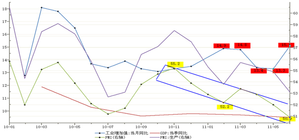 宏观经济方面,4月的工业增加值同比13.4%,比上月回落1.4%,从3月份开始代表经济领先指数的PMI连续下跌,从其分项构成来看,代表内需的新订单指数出现连续下跌,显示内部需求不足,代表库存水平的原材料库存和产成品库存出现反向上升,说明经济的“去库存”压力较大。这点可以从进口的同比数据上得到验证,进口增速回落证明国内总需求有减弱趋势。市场对宏观经济的关注点也从复苏转向“硬着路”。(图5)