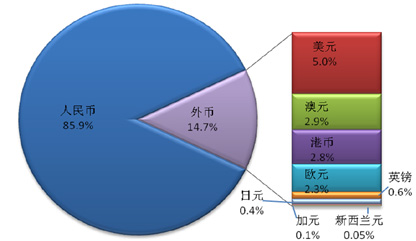 从理财产品的投资币种来看,2011年人民币银行理财产品共发行17408款,占到了全部产品数量的86%,占比较去年上升了4个百分点。而外币类产品仅占14%,数量为2862款。与去年不同的是,今年新增发售了10款新西兰元产品,占比0.05%。总体而言,2011年各币种占比较去年变化不大,下降幅度最大的为美元产品,欧元产品升幅最大。详见图2