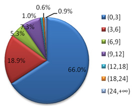 从理财产品投资期限方面来看,2011年银行理财产品的平均期限为0.33年,同比缩短0.05年。周期滚动的开放式理财产品逐渐取代以往短期理财产品的功能。从理财产品期限分布来看,短期理财产品依然为市场主流。近九成理财产品的投资期限均不超过半年。详见图6