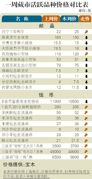 清明小长假前后的藏市表现平淡,不少热点品种因受抛压影响,价格出现回落,很大程度上影响了投资者介入积极性。邮市:以第三轮生肖版张为主的近期热点邮票继续振荡,交易量萎缩依然显现出市场投资者短线信心的不足。好在JT强势品种再度崛起,令市场颓萎之势消弥。上周末,“齐白石”小型张和套票价格分别攀升到2500元和900元附近。币市:整体走势仍然偏淡,2012版“熊猫”1盎司金币和银币继续在11500元和280元附近波动。鉴于市场即将迎接“熊猫金币发行30周年”金银套币,所以市场观望气氛趋浓也在所难免,其中1盎司金币的期货报价在1.8万元上方。