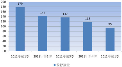 与2011年各季度相比,信托行业在2012年的第1季度显得有些冷清,产品发行数量同环比均大降:共有57家信托公司发行了信托产品,新发产品663款,较2011年第4季度的1092款减少近40%。通过调查发现,许多信托公司都放缓了新产品的发行,如2011年第4季度以161款位居发行之首的长安信托仅发行了43款,而本季度发行量最大的信托公司也仅发了54款。