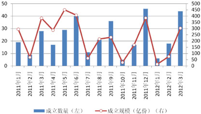 从成立类型看,分别有42只股票型(包括指数基金、QDII基金;分级基金分开计算)、4只混合型(含保本型基金)、20只债券型(分级基金分开计算)和2只货币市场型基金成立。虽然2012年1-2月A股市场呈触底反弹的走势,为基金销售市场营造了较好的氛围,但总体来看,投资者对于偏股类产品依旧保持谨慎态度,平均首募规模仅为4.62亿元,债券型相对受欢迎,平均首募规模达8.34亿元。此外,1季度首募规模前三的座席均被债券型基金所占,其中广发聚财信用B募集到34.29亿元,为本季度募集之首。