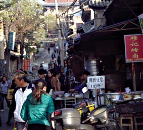 窄街上的行人渐渐多了。经过一个菜场,新鲜的蔬菜或堆放在地上的旧布单上,或在木头小车上。去吃“凉鸡米线”,一家不大的小铺,看上去很有些年头了,铺里整齐摆放着四方小桌和长凳,旧是旧了,却是整洁。粗碗盛着莹白的米线,撒些碎花生米和鸡丝,味道极好。咿呀咿呀的胡琴声隐约传来,悠闲的底子便露了出来。