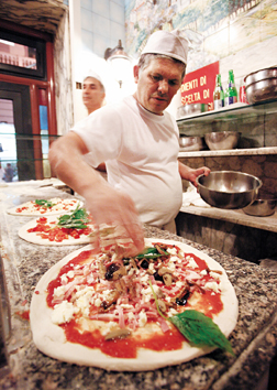 那不勒斯美食众多,但具代表性的是源自于此的意式薄饼。1889年,意大利皇帝与皇后Margherita到访那不勒斯,餐厅特地用意大利国旗的三种颜色,红色番茄、白色Mozzarella芝士、绿色香草罗勒来制作薄饼,得到皇后喜爱,因而命名为Pizza Margherita。薄饼的制作过程有极其严谨的规定:粉团必须以特定的小麦粉、酵母、盐与水,以人手或慢速混合器混合;粉团与配料必须以人手平放在烤板之上,饼底中心部分厚度不得超过三毫米;继而放进烧木的传统火炉,烤焗一分至一分半钟。CFP