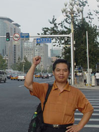 2009年,钟敏灵在北京找到妻子时做胜利手势。图片由受访者提供