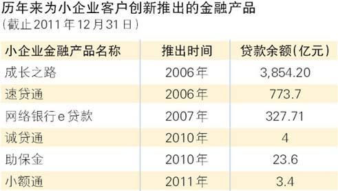 ● “小额通”、“信用贷” 建行不断为小企业客户研发和推出新产品。2011年,推出“小额通”为小企业提供便捷、快速的贷款通道;试点推出“信用贷”,为不具备有效抵质押物的优质小企业客户提供纯信用类贷款,有效缓解小企业客户担保难、融资难的问题。