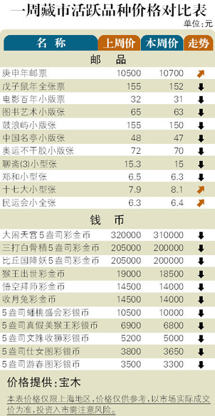 藏市经过10天回升后,再度出现回调表现,部分品种振荡加剧,尤近期热点邮品最为突出,显示出市场短线将步入振荡状态。邮市:新发行的“明清承具”小本票跌至9元左右,仅为邮局售价的75%。“壬辰龙”赠送小版张下挫到49元,“桂花”和“无锡亚展”无齿小型张分别为330元和58元。老邮中的纪71“开国大典”邮票价格攀升到2300元,“中美邮展”小版张盘旋在8200元附近, J22“毛主席纪念堂”套票坚挺在85元。币市:“壬辰龙”彩金银币微挫到3450元,“壬辰龙”5盎司彩银币跌至6200元,“五台山”1公斤银币下滑到14800元。2012版“熊猫”1盎司金币和银币分别回调至10300元和255元。