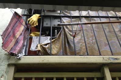 这里从外观看,并不象想像中的政府公屋,至少是干干净净、整整齐齐的,每栋楼也都有一个自己的名字,比如“百合楼”“荷花楼”之类的,都是些略带着小小温柔的名字。上了扶梯,便到了苏屋村的第一个中心区,房子里面是不让进去的,站在院子里,丝毫感受不到寒酸和艰苦,只是,人气也少的可怜,大概是已经拆迁了一批的缘故吧,环顾四周,一个行人都没有,只在拐角处的地上坐着一位大叔,不知道他在干什么,沿着上坡前行,两边已是拆迁完毕正在重建的区域,被铁皮围着,一路走过,还是没有一个人。傍晚时分,摄影任务完成的差不多了,一份探寻他们生活的好奇油然而生。又绕回到进门处的小天井,轻轻地走到住家的边上,假装住户般坦然经过,有晚饭飘来的香。在一家半敞开的门前,我努力的朝里面望了望,不禁地怔住了,一个大约不到10平米的房间,上下一共4张床,顶头有一张桌子,上面堆着无数的东西,门边是一个灶台,上面也堆砌了不少杂物,想是做饭时才会挪开使用而平时也当作桌子的吧,一个女人正坐在床边看着一个10寸左右的小电视,手里拿着一个什么东西缠绕着,看不清楚,这,就是他们的生活吗?也许是的。