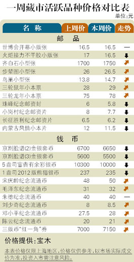 7月中旬,邮市的表现有所趋强,藏市热点非常的明确,基本上集中在第三轮生肖版张上。而币市依然沉迷于歇夏,热点稀落。邮市:“壬辰龙”版张的持续走强势头终于带动第三轮生肖版张的回升,“甲申猴”、“乙酉鸡”、“丙戌狗”、“戊子鼠”和“庚寅虎”全张票分别扬升到650元、202元、92元、162元和160元,而“改革开放”、“洛阳世展”和“无锡亚展”双连小型也张分别上涨至44元、72.5元和35.5元。币市:过去的一周,市场热点集中在新品上,其中“五台山”金银套币微升到4750元,而“京剧脸谱(3)”金银套币则快速反弹至5600元附近,“京剧脸谱(3)”5盎司银币则一度大涨到7500元。