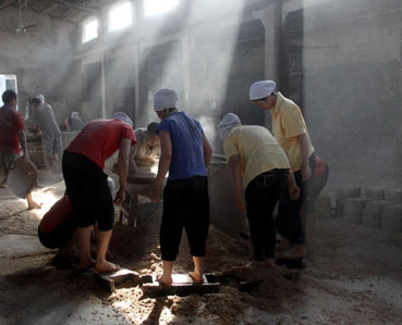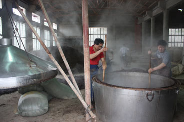 6、茅台的基酒生产车间同样简陋,且一样的原始,原始得令人吃惊,犹如一个放大近百倍的家庭酿酒作坊,除了车间里的行车,这里根本看不到任何现代化工厂的痕迹。