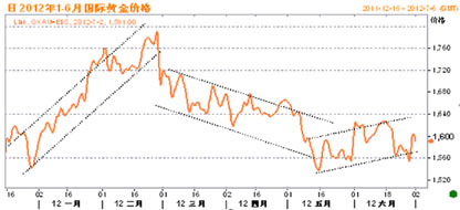 第三阶段:5月中旬至今,国际黄金价格在触及半年内低点1527.21美元/盎司后维持低位区间震荡,因6月美联储未能推出QE3令市场失望,同时欧债危机致美元被动走强,黄金始终未能有效突破1600美元/盎司。然而,6月最后一个交易日,欧盟峰会取得的重大进展令风险资产大幅上扬,欧元兑美元录得8个月来最大涨幅,黄金更是大幅上涨3%,是否能带动一轮反攻行情令市场关注。