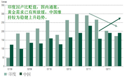 2012一季度黄金珠宝需求为519.8吨,比去年同期降低了6%。价值口径计算,需求则达到了创纪录的283亿美元。根据世界黄金协会统计,中国连续三个季度超越印度成为全球黄金珠宝的最大需求国,第一季度需求量为156.6吨,同比增长8%,占全球需求量的30%,印度黄金珠宝需求受一系列负面因素如征收黄金进口税和金饰消费税等打压而表现不佳,第一季度需求量152吨,同比下跌19%,占全球需求量的29%。