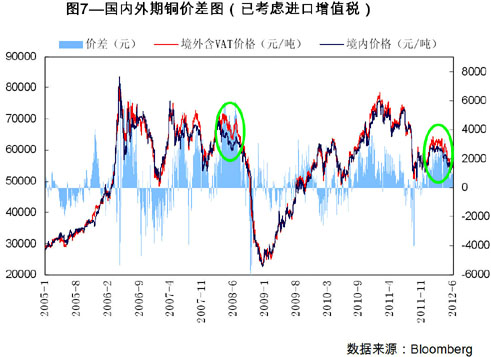 中国自2011年下半年起便大量进口铜(见图6),但是该期间境内铜价远低于境外(见图7)。一般情况下,进口商会在境外铜价低于境内的时候加大进口,而在境内铜价贴水时减少进口,但是在2008年和2011年至今的境内铜价显著贴水时,铜进口量却逆势激增。