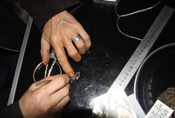 吴水根为我们表演了拉丝,就像江南竹匠拉竹丝那样,把银子拉成几厘米状的银丝,有时还要拉成头发细的丝,吴水根说拉丝非常难,拉一根银丝有时要用几个小时。说着,他又拉出一根