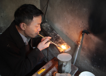 吴水根拿起由小铁管输送氧气的油灯,先点着火,然后用嘴吹,吹得短促有力,随着用力程度火苗变换着强弱,只吹几下,银条就在火焰中融化了。这是他祖辈传下的传统焊接方法,祖辈就靠这门手艺贴补家用。