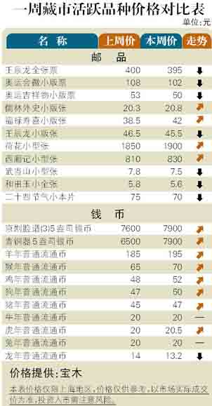 9月中旬藏市表现渐趋活跃,成交日趋增多,不少品种买气增大。币市几乎被新面世的“青铜器”金银币所主宰,市场热点聚焦于此。邮市:交易量增多,但热点并不平衡。过去一周市场体现出“老邮”热、新邮跌特征。其中“从小爱科学”、“齐白石”小型张分别攀升到12800元和1900元,“雷锋题词”套票重新回升至150元附近。而新邮中的“伦敦奥运会”小版张下挫到10元,“资本市场”小版张跌至48元。币市:“龙年”(贺岁)流通币价格在上扬到15元附近遇阻回调,本周初的市价盘桓在13元左右。“青铜器”金银币亮相后受到藏家和投资者欢迎,市场表现不俗,其金银套币市价在5200元附近,而5盎司银币为8000元。