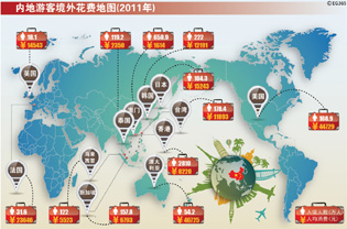 2011年,每个中国游客平均在澳大利亚花了4.67万元,在美国花了4.47万元,在法国花了2.36万元。而在国内,2011年营收高达2.25万亿,相当于全国财政总收入的五分之一。