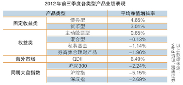 2012年以来,国内资本市场持续低迷,投资者心态日趋谨慎。不过,与去年的全军覆没相比,今年的投资理财市场并不缺乏亮点:债券型基金前三季平均收益率达到了4.65%,稳居国内各类基金之首。与资本市场紧密相关的权益类产品业绩虽然乏善可陈,但从前三季度数据来看,公募、私募、券商理财计划这三大权益类产品平均业绩都跑赢了大盘,不过座次还是略微出乎多数投资者的意料:公募基金(股票型)成为唯一正收益的品种占据首位,私募基金居中,券商集合理财产品垫底。