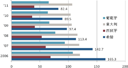 总体看来,困扰欧元区经济的问题有二:一是债务占GDP比率过高;二是失业率严重,今年10月份欧元区失业率为11.7%,是自2011年9月以来连续14个月创历史记录。(图3)