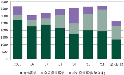 黄金ETF投资需求延续发展态势,2012年前三季度ETF及相关投资需求大增134%至189吨。其中3月底到5月,由于金价筑底波动较小,黄金ETF持仓减少56吨至2423吨,一半来自SPDR的减持量。随着金价回升,黄金ETF投资需求上升,8月份持仓重回2500吨上方。值得注意的是,第三季度黄金ETF投资需求上升的同时,金条金币投资需求下降,这种分歧反映了不同类型黄金投资者投资习惯的差异,ETF投资者对各国宽松货币政策持欢迎态度,而实物金投资者对此有所迟疑并选择获利了结。
