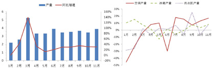 家电行业今年前半年产量低迷,截至11月,对精铜需求负增长。空调和洗衣机产量在年初同比有较大下滑,随后虽然产量同比不断增加,但仍较去年全年产量同比略有下降。冰箱产量整体保持与去年同等水平。值得忧虑的是,