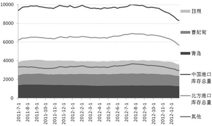 在下游需求下降的影响下,钢铁价格与铁矿石价格均在三季度出现暴跌,钢企全面亏损,其维持生产所用的铁矿石主要来自对现有库存的消化,铁矿石进口量于十月锐减,而去库存的过程一直持续至年底。根据上海钢之家的统计数据,2012年四季度至年底,中国的铁矿石库存港口都经历了较快的去库存过程。总库存从7月峰值10010万吨降至12月底的8280万吨。由于中国重工业主要集中在北方地区,因此北方港口的库存下降幅度较为明显,以最大的三个铁矿石港口青岛、曹妃甸和日照为例,三大港口库存分别从七月中旬下降至年底的100万吨、190万吨和200万吨,北方港口总库存下降了1270万吨。(图7)