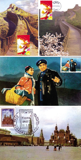 如果是专门制作邮集参加展览,还要考虑收集大量的与专题有关的国外和台港澳极限片,现在也有人在做这方面的事,通过各种渠道把国外和台港澳极限片(台湾叫原图卡)引进来,一枚前苏联1955年戳莫斯科红场钟塔极限片(图4),在中国售价要超过400元。这枚片可以用来制作建筑、时钟、文化遗产、广场等专题的邮集。
