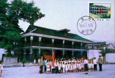 1971年9月发行的《革命圣地》(三)中“遵义会议旧址”(35分)一枚,贴在同名明信片的图画一面上,票图与片图最大极限一致,但不使用原图放大,加盖“贵州遵义市(19)”邮戳,制作即告完成。