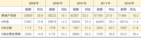 2012年全国房地产开发投资总额71804亿元,同比增长16.2%,虽低于往年20%—30%的增幅,但符合国家经济转型发展的要求且与国家GDP增速放缓相一致,全年投资总额再创历史新高。其中住宅投资总额49374亿元,同比增长11.4%;办公楼投资和商业营业用房投资同比增长分别为31.6%和25.4%,远远高于住宅投资增长幅度。(表1)
