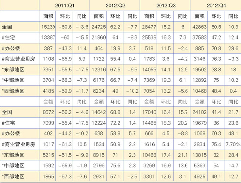 表5 2012年全年各季度商品房销售情况(单位:万平方米,亿元,%)