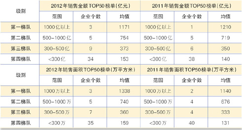 销售金额方面,千亿以上的超大型房地产企业个数增加,从2011年的仅有万科1家,扩充至2012年的万科、绿地、保利3家。绿城和华润成为第二梯队的新秀,第二梯队个数仍保持在5个。第三梯队个数从2011年的6个增加至9个,300-500亿的阵营竞争加剧。销售面积方面,几乎与销售金额梯队保持一致,第一梯队个数增加1席,数量已达3家,其他梯队表现上,企业整体向前靠拢的趋势明显。(表7)