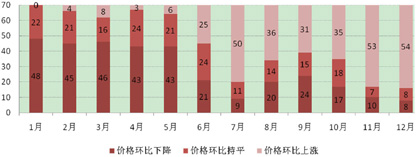 图1 70大中城市新建商品住宅环比价格上涨、下降和持平城市个数变化情况