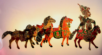 陇东一带把表演皮影用来投影的白色“幕布”叫“亮子”,把“亮子”后面演员活动的用麻绳围成的区域叫“城”,“亮子”一般长