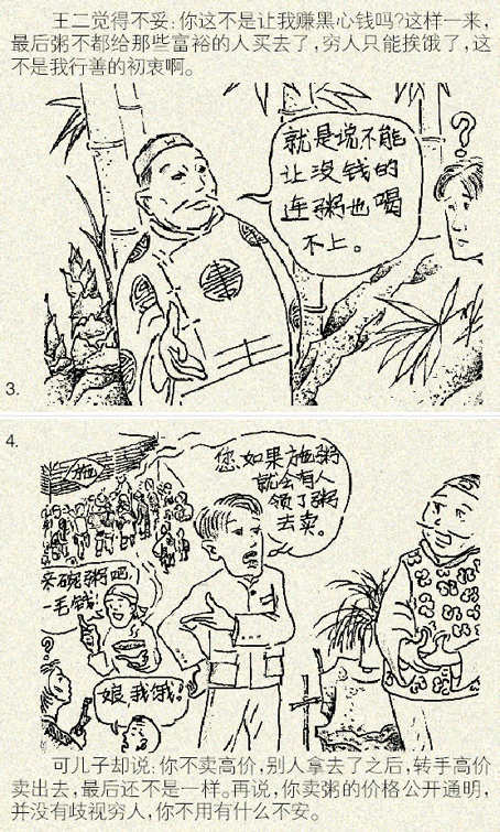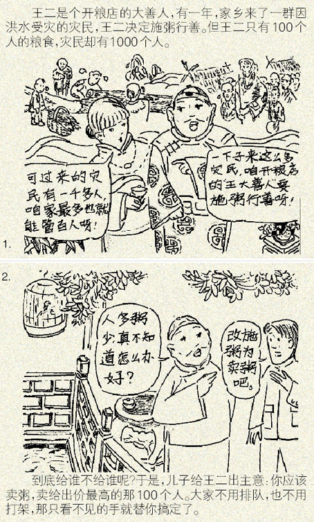 王二的困境影射了当下,提价是否是解决春运期间“一票难求”的灵丹妙药呢?火车票提价是有分配后果的。这里面有两层含义:其一,通过提价,挤出的恰恰是社会的弱势群体;其二,乘客要给铁道部门更多的钱。因此,反对提价的人也是有充分理由的。归根结底,春运票价的辩论不只是价格问题,更是一个分配问题,而用非价格手段解决分配问题也会带来各种负面影响。看来,王二这碗粥该如何施还真是门学问。