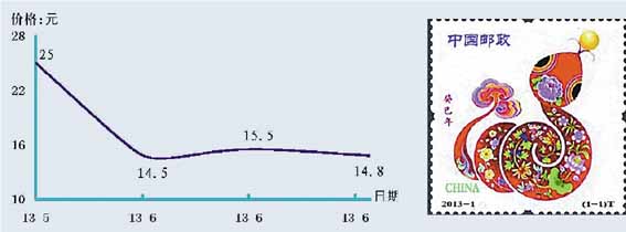 生肖邮票的跌势相对较小,除了新发行的“癸巳蛇”振荡频仍外,其他品种的走势相对稳健,尤其是第一轮生肖票的调整基本结束,阶段性底部盘桓迹象明显。如“辛酉鸡”、“壬戌狗”、“癸亥猪”和“甲子鼠”全张票分别在22000元、4500元、7800元和2800元有买盘求购,“庚申猴”、“辛酉鸡”、“壬戌狗”、“癸亥猪”和“甲子鼠”邮票则分别扬升到11700元、180元、28元、55元和16.5元。而随着明年“马年”的逐渐临近,市场上收购前两轮生肖“马年”邮票者不断增多,其中第一轮“庚午马”全张票、四方连和套票的收购价格分别是升至50元、22元和5元,第二轮“壬午马”全张票的价格上扬到1000元,套票价格在20─22元之间。
