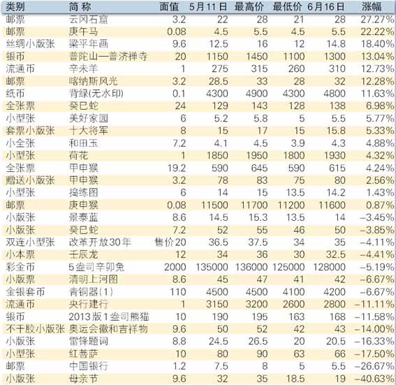 编者按:2013年已走过了一半时间,回眸半年来的藏市走势,基本上可以用“弱势调整”来形容。因为从整个市场各板块的具体表现看,回调中见弱是共同特征,无论是老邮还是新邮,也无论是金银币、纸币还是流通币,都无一例外地出现了振荡下跌趋势。本期就今年5-6月的邮币卡板块及热点品种进行盘点和点评。