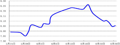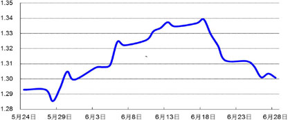 上周,人民币兑美元中间价呈横盘整理走势,当周变化不大,于上周五报6.1787元,较6月21日微跌0.03%;欧元兑美元下跌0.87%,报1.3008美元。